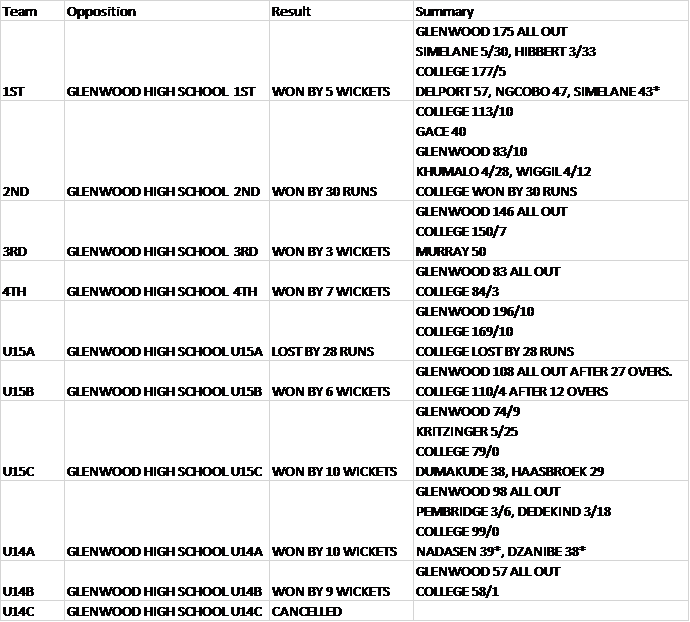College started the run chase with an indifferent single but after that settled in well. Openers Stefan Delport and Makabongwe Ngcobo ran well and were able to hit the bad ball to the boundary. Ngcobo was first man out for a well-played 47 off 49 balls, with College at 98 for 1. College got to tea without any further loss, and at 25 overs were at a comfortable 116 for 1. The Glenwood team came out firing after tea, picking up four wickets in three overs, leaving College 119 for 5. Simelane and Bryn Brokensha were able to absorb the pressure and build a match winning partnership over the next 12 overs, with Simelane winning the game for his team with a six, over mid-off, off the first ball of the 40th over.