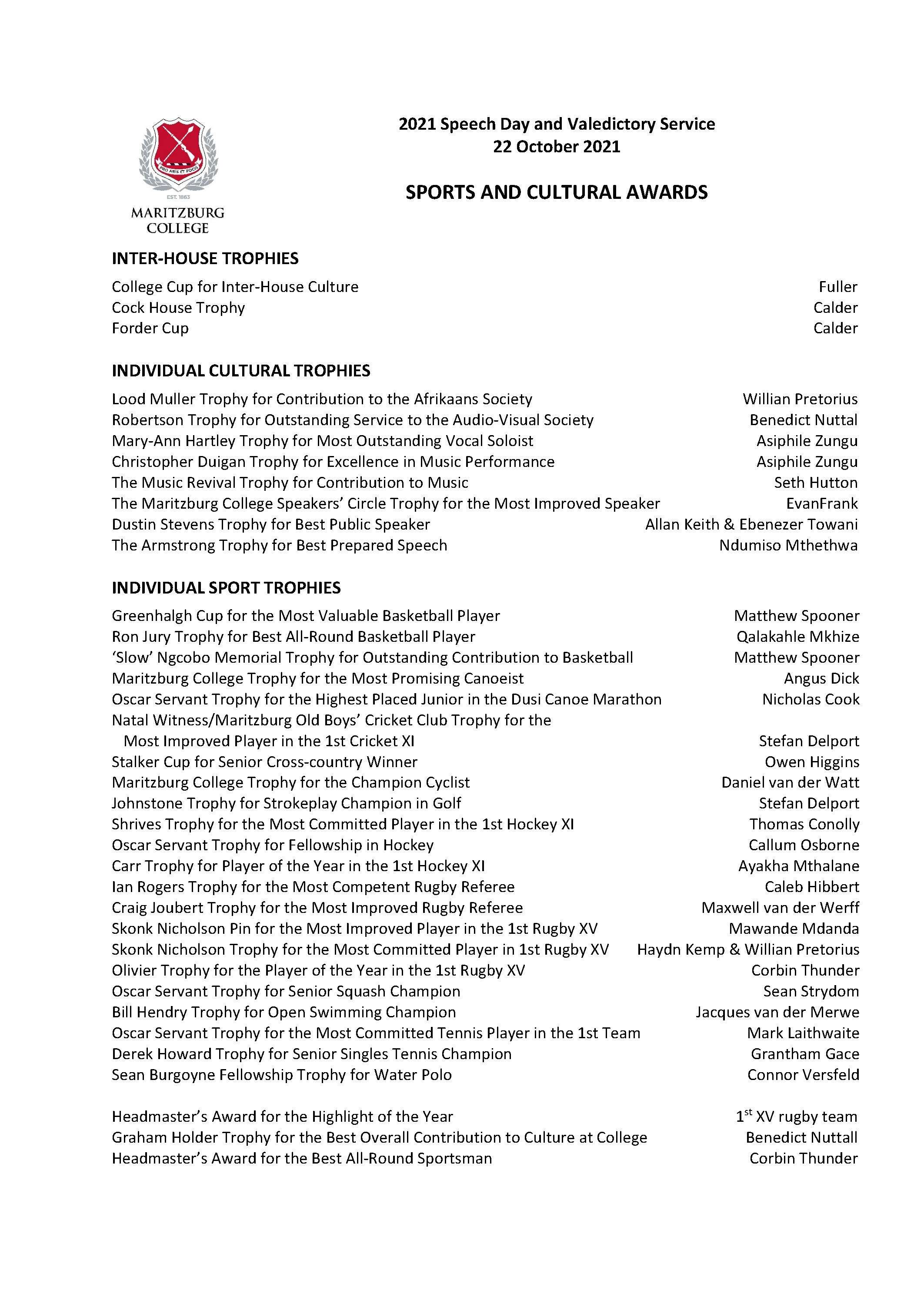 Well done to all the Class of 2021 – these are young men of stature who can go forward with pride and courage, knowing that their time at Maritzburg College has prepared them well for wherever their lives take them.