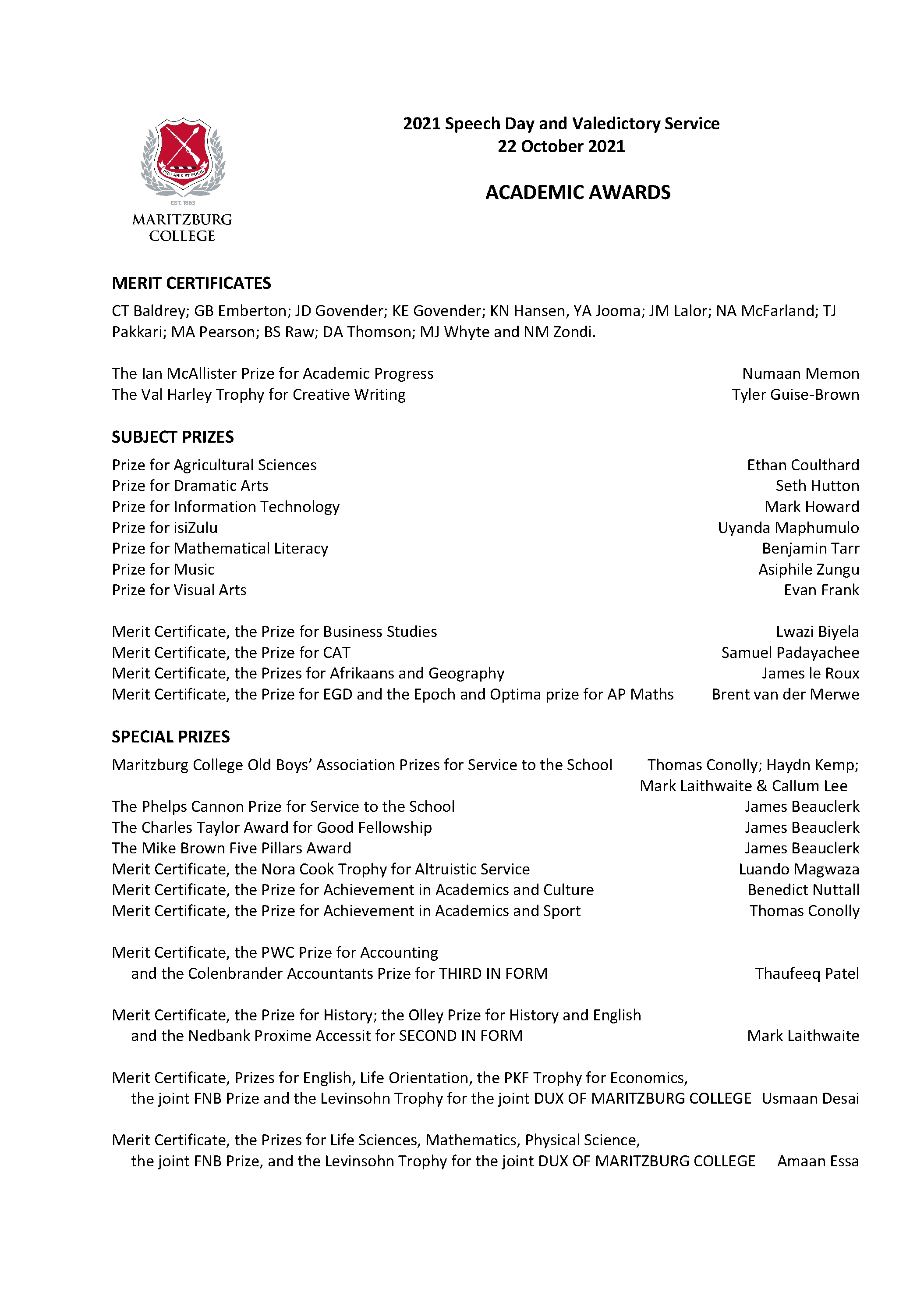Special congratulations go to our joint Duxes for 2021, Usmaan Desai and Amaan Essa; both boys were awarded the FNB Prize and the Levinsohn Trophy for the Dux of Maritzburg College. Usmaan also received a Merit Certificate, and Prizes for English, Life Orientation, and the PKF Trophy for Economics. Amaan was awarded a Merit Certificate and the Prizes for Life Sciences, Mathematics and Physical Science. Second in 6th form was Mark Laithwaite , who received a Merit Certificate, the Prize for History; the Olley Prize for History and English and the Nedbank Proxime Accessit. Taking home the PWC Prize for Accounting and the Colenbrander Accountants Prize for 3rd in Form was Thaufeeq Patel.