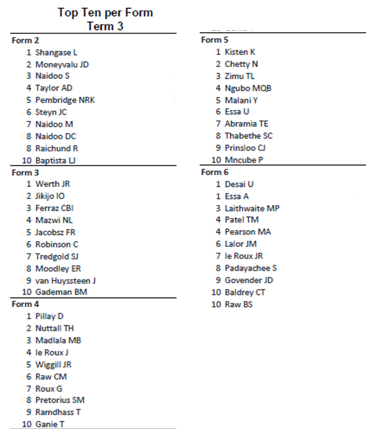 Congratulations to the top 10 boys in each of the forms, following the announcement of the Term 3 academic results.