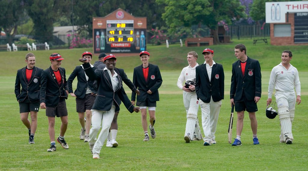 After their 5-wicket win over old mates, DHS, on Goldstone’s, the 1st XI leave the field as they enjoy Andile Simelane’s exuberance.