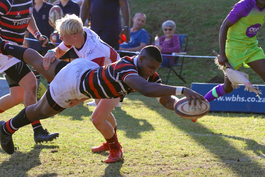 Maritzburg College’s Number 8, Sphephelo Mbonambi, lunging for the try line to score in an exciting encounter with Westville, which saw College come from behind 7-26 to win the match 42-26.
