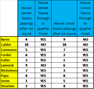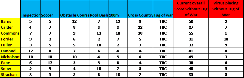 Current house point standings are as follows; although we await Tug -Of- War finals still to be held on Friday at the Inter-house Athletic Championships: