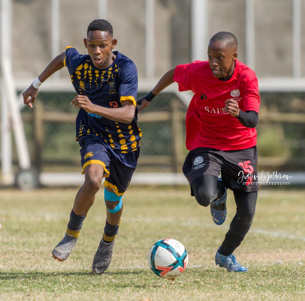 134 years of intense footballing rivalry between Maritzburg College and Durban High School as College player Zipho Makangela and DHS’ Sinalo Nyawose contest for the ball.