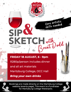 Join us for a fun evening with renowned artist, Brent Dodd, who will guide you step by step to create your own masterpiece in a relaxed and enjoyable environment. Brent is now living in Zimbabwe, so this is a unique opportunity to enjoy one of Brent’s spectacular sip + sketch evenings while he is back in South Africa for a visit.